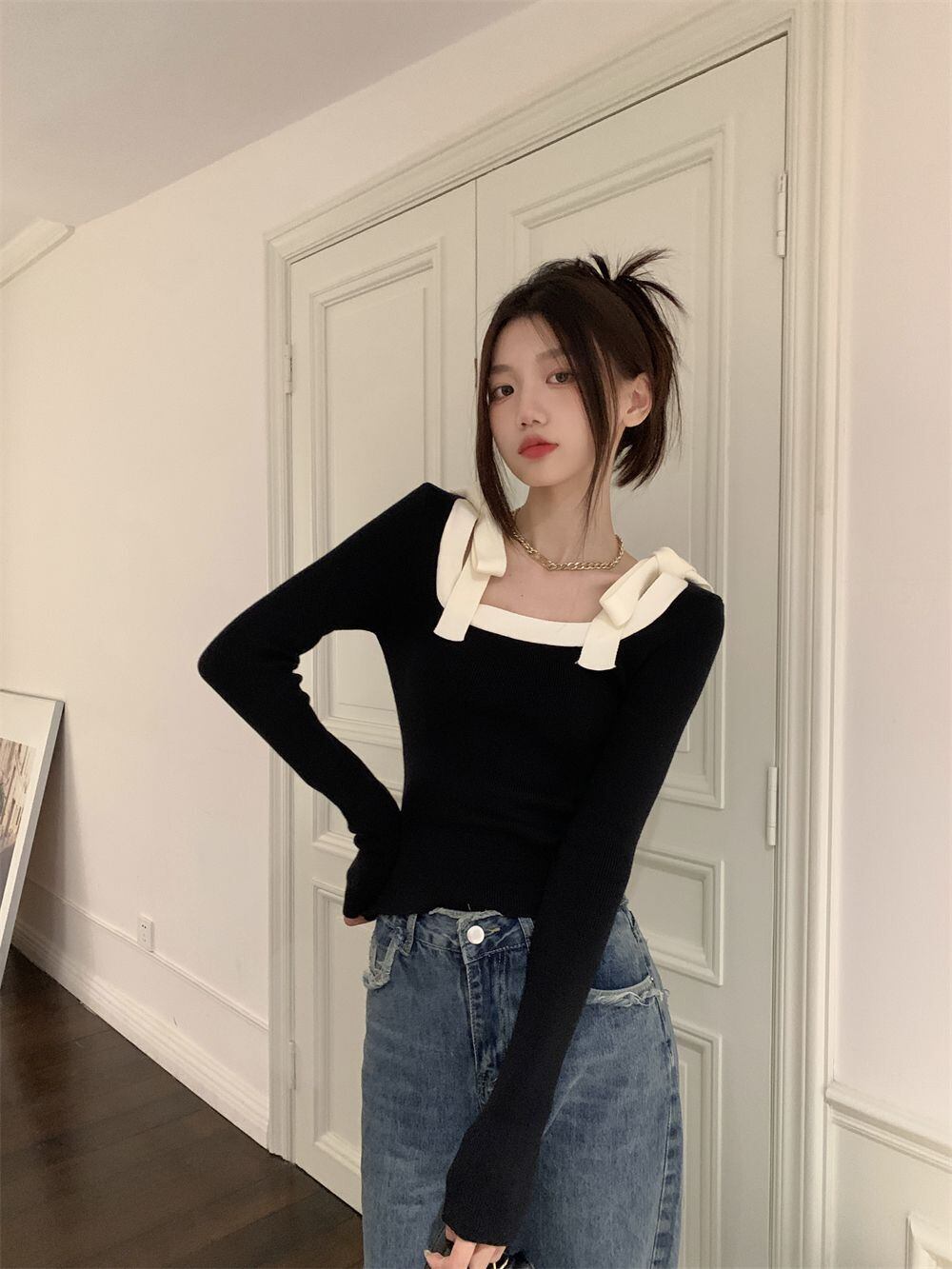 セータースクエアカラーボウコントラストロングスリーブストレッチニットクロップトップスベーシックプルオーバーセーター リボン 長袖 スクウェア