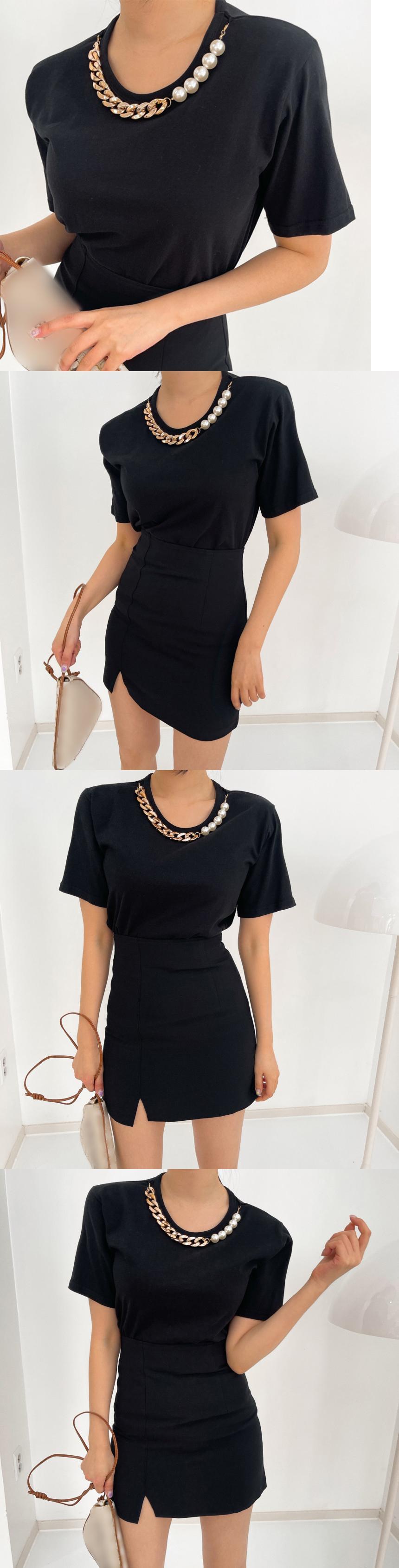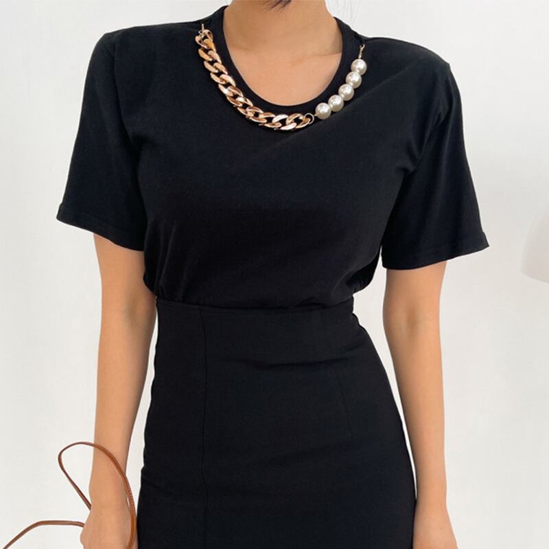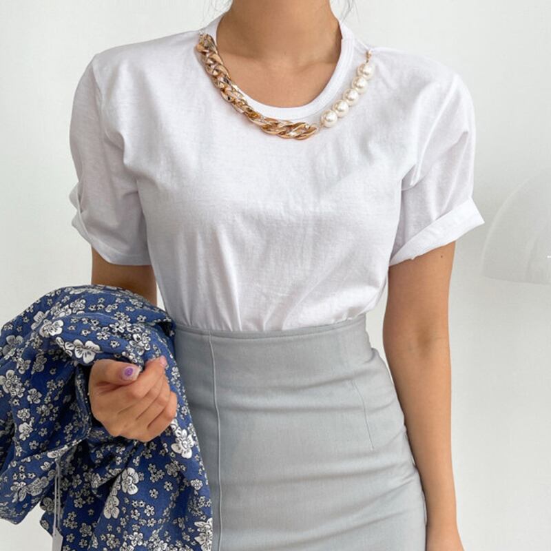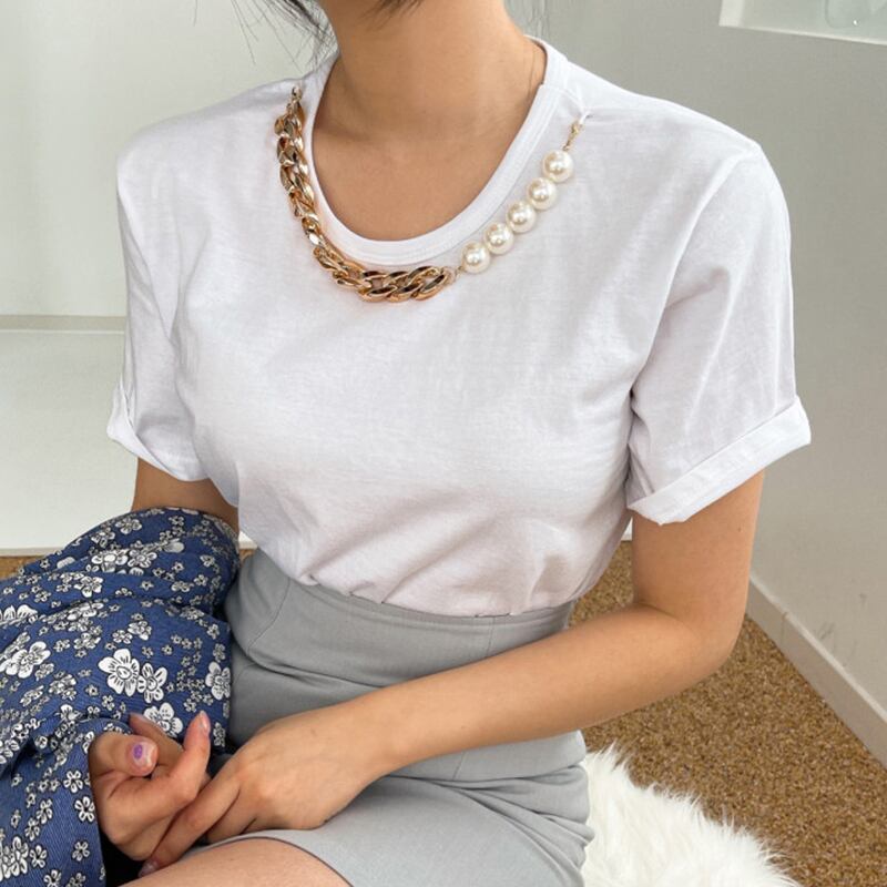 クルーネックパールチェーンルーズ半袖 Tシャツトップ夏シャツ白 Tシャツグラフィック Tシャツ Ropa ショート ホワイト ハーフスリーブ サマー 夏物 真珠