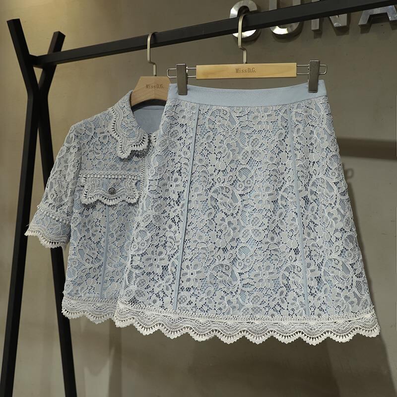 オフィスレディブルーレースシャツセクシーツーピースセットボディコンスカート夏ファルダストップブラウス サマー 夏物 会社 学校 通勤や通学にも