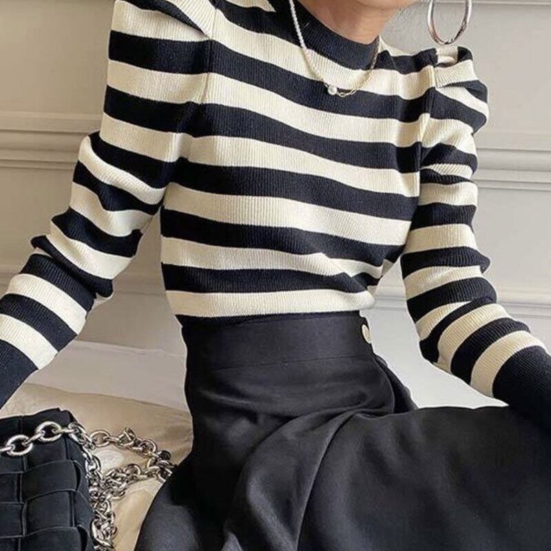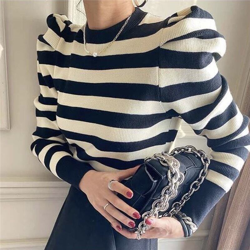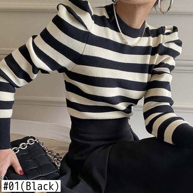 セーター ショルダーパッド 長袖 レトロ コントラスト ストライプ ニット セーター ルーパス ジャンパー レディース トップス ロング
