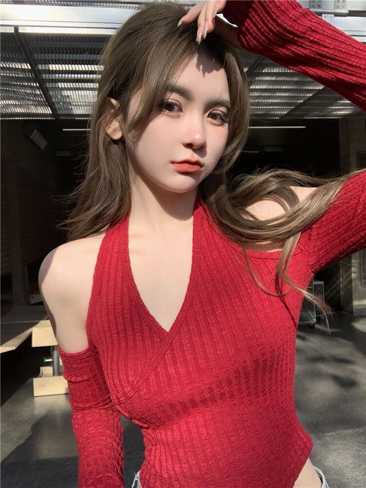 セクシーオフショルダーセータープルオーバー V ネック赤不規則ニット長袖トップホルタージャンパーセーター ロング レッド Vネック