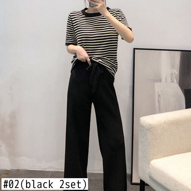 半袖 Tシャツストライプ Tシャツトップ夏ルーズワイドレッグパンツ 2 点セットニットズボン ショート ハーフスリーブ サマー 夏物 ワイドパンツ