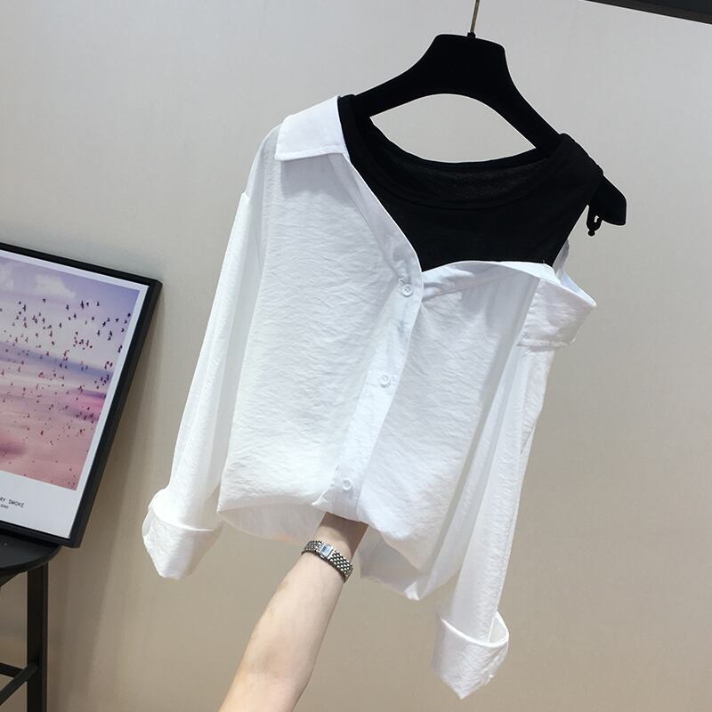 セクシーオフショルダートップフェイクツーピースブラウスシックボタンシャツデモーダ春シャツ スプリング 春物