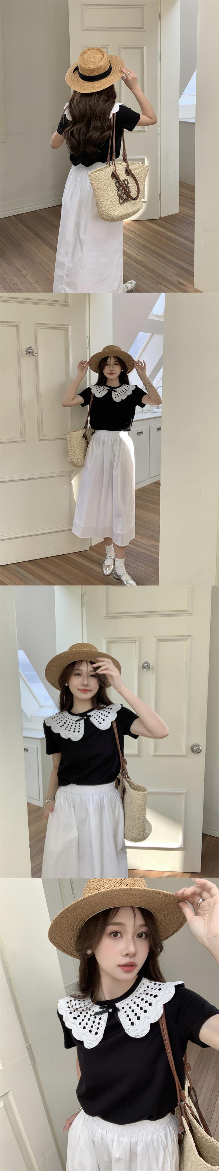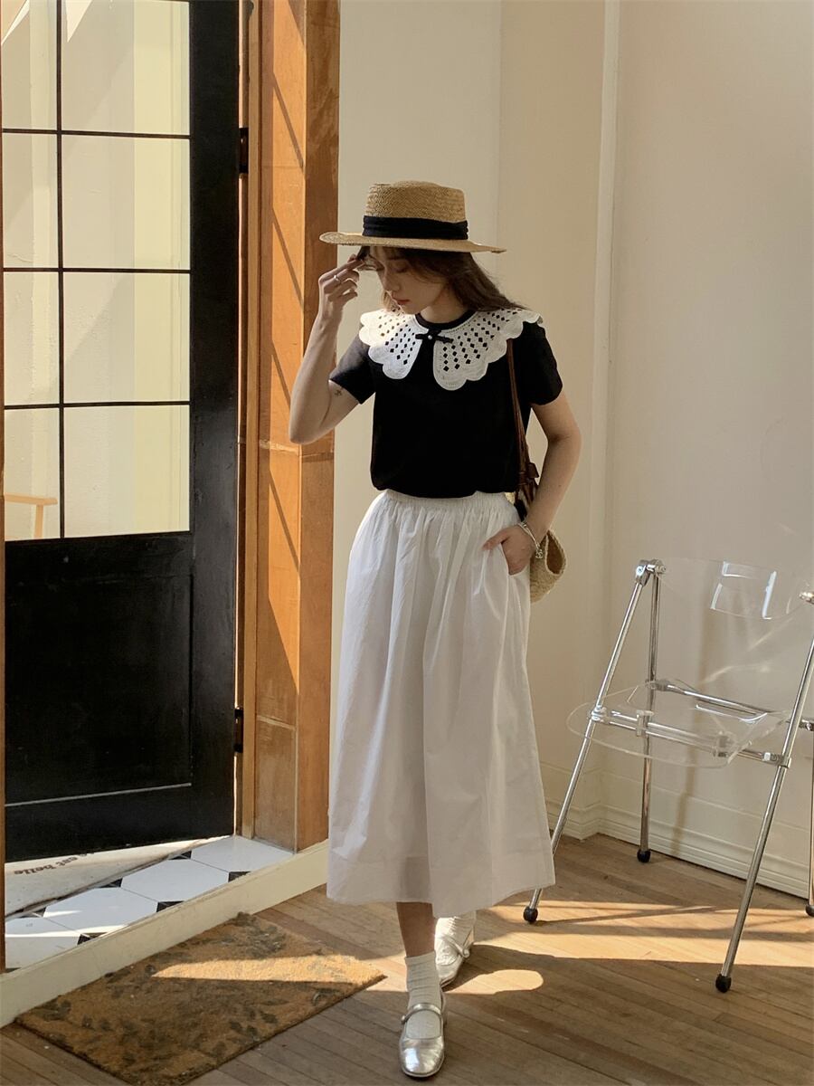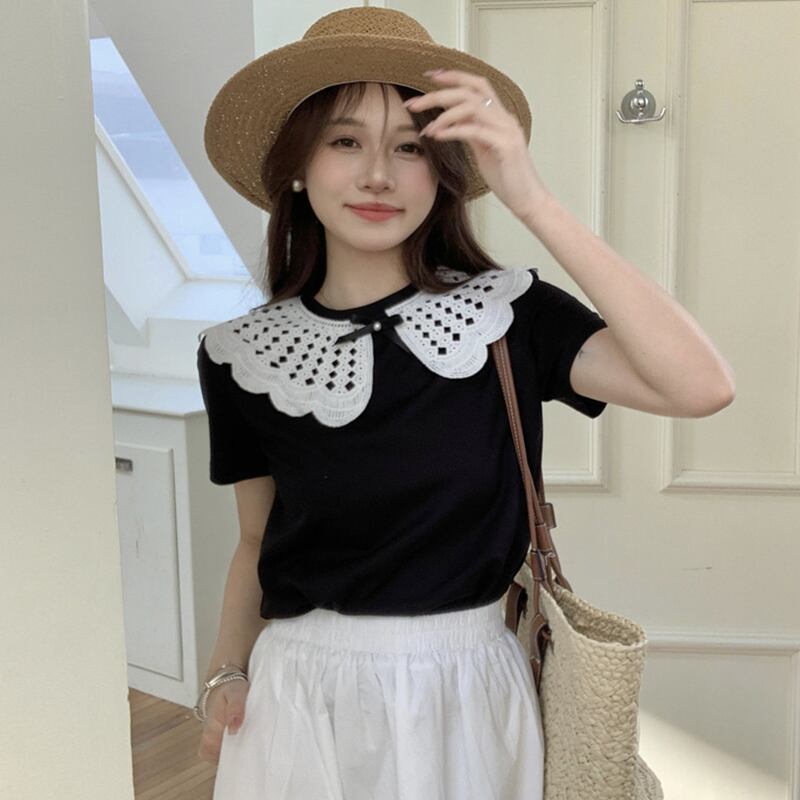 夏人形襟白半袖トップスパッチワークカットアウトレースルーズ Tシャツ甘い Tシャツ Ropa ショート ホワイト ハーフスリーブ 大人ガーリー スウィート キュート カジュアル サマー 夏物