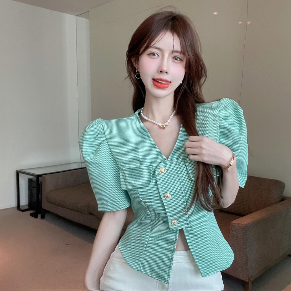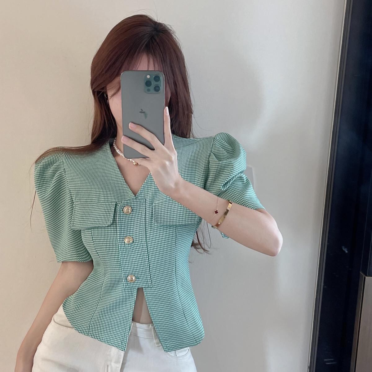 半袖カーディガン夏ジャケットパフ黒チェック柄シャツスリム不規則トップスカミーサブラウス ショート ブラック ハーフスリーブ サマー 夏物