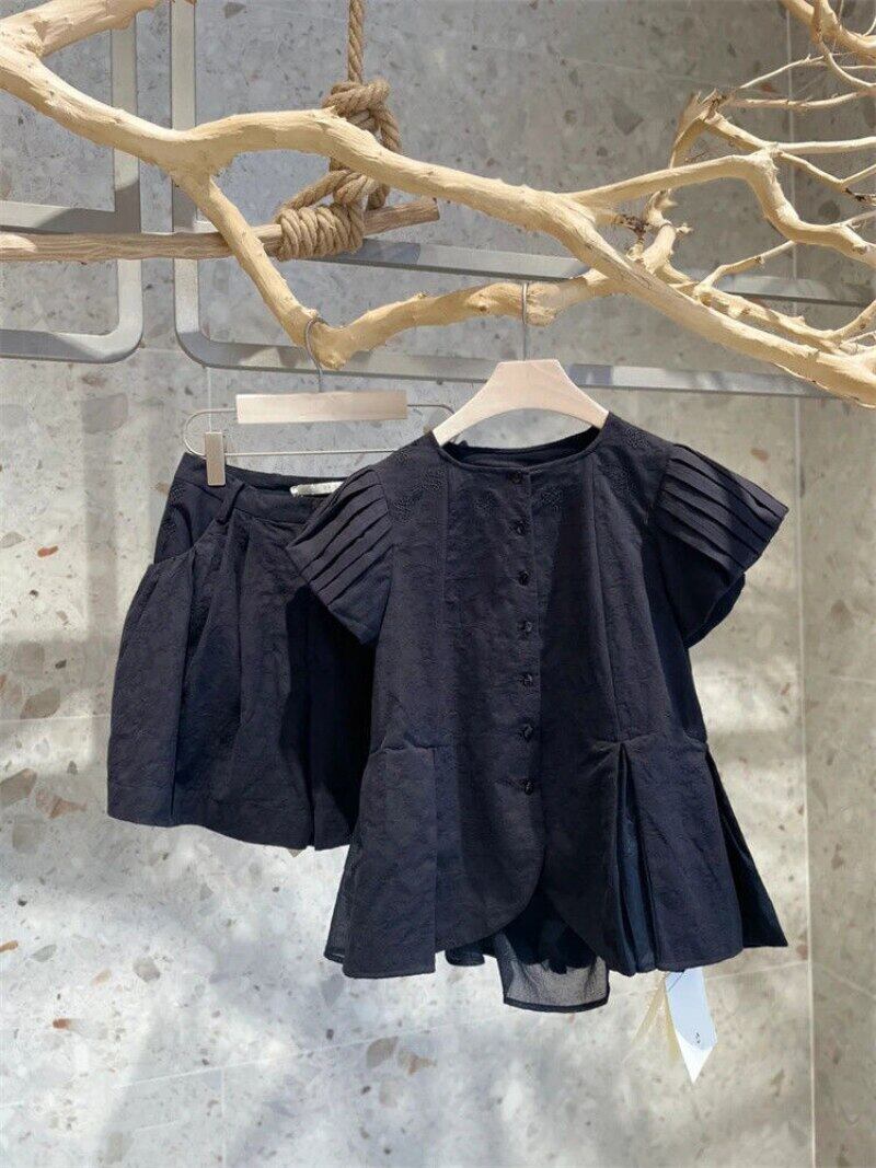 ワイドレッグショーツセットフライスリーブフリルトップ O ネックホワイトプリーツブラウスワイルドスプリングシャツ 2 点セットフレンチ 春物 ブルマー Oネック ワイドパンツ