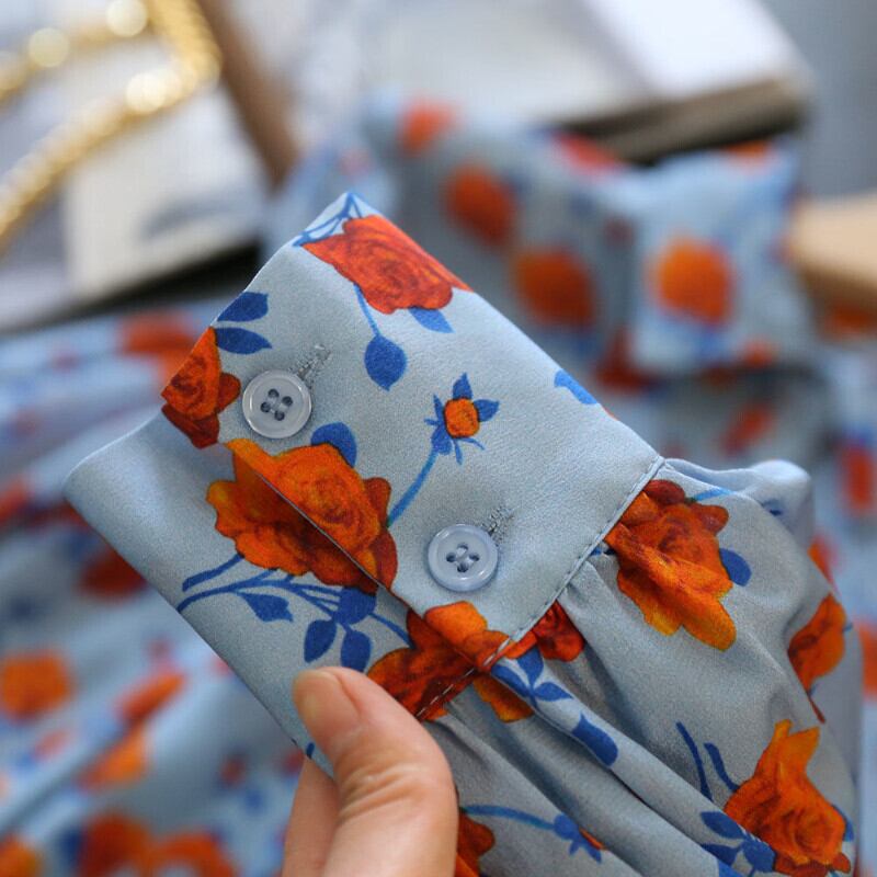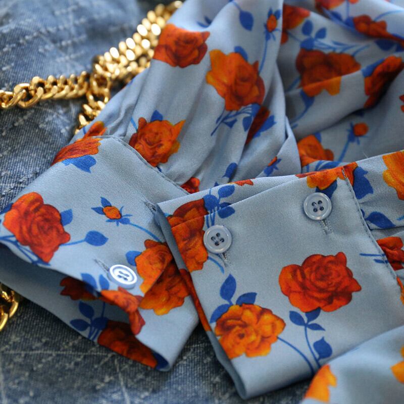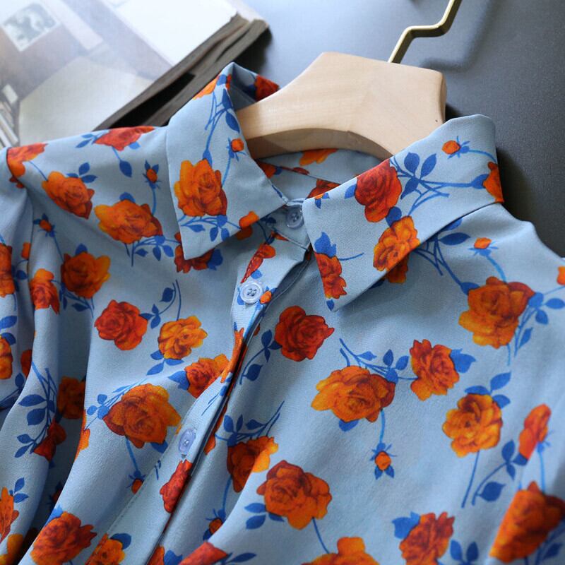 ブルーフローラルシャツモーダシャツ春プリントローズシャツカミサトップオフィスシフォン スプリング 春物 花柄 会社 学校 通勤や通学にも