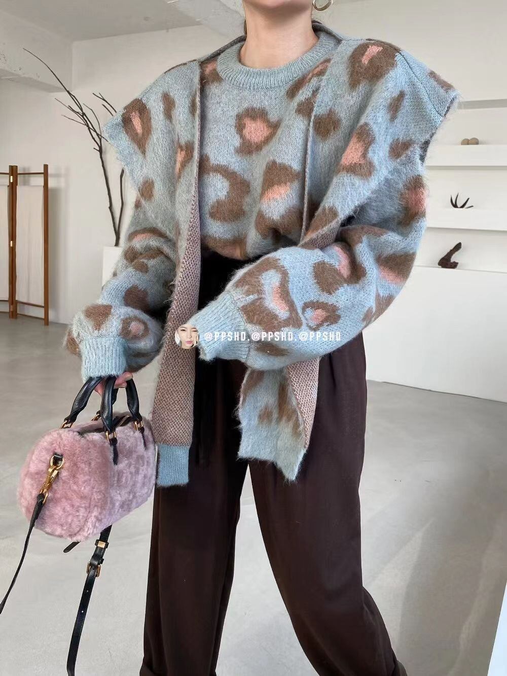 冬ルース長袖ヒョウセーターショールセーター Y2k 服 2 点セットプリント長袖トップ ロング ウィンター 冬物