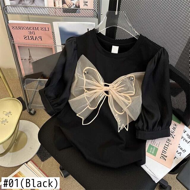 特大グラフィック Tシャツ春メッシュ弓クロップトップスバブル半袖 Tシャツ Ropa 黒 Tシャツ Y2k 服 ショート ブラック リボン ハーフスリーブ スプリング 春物