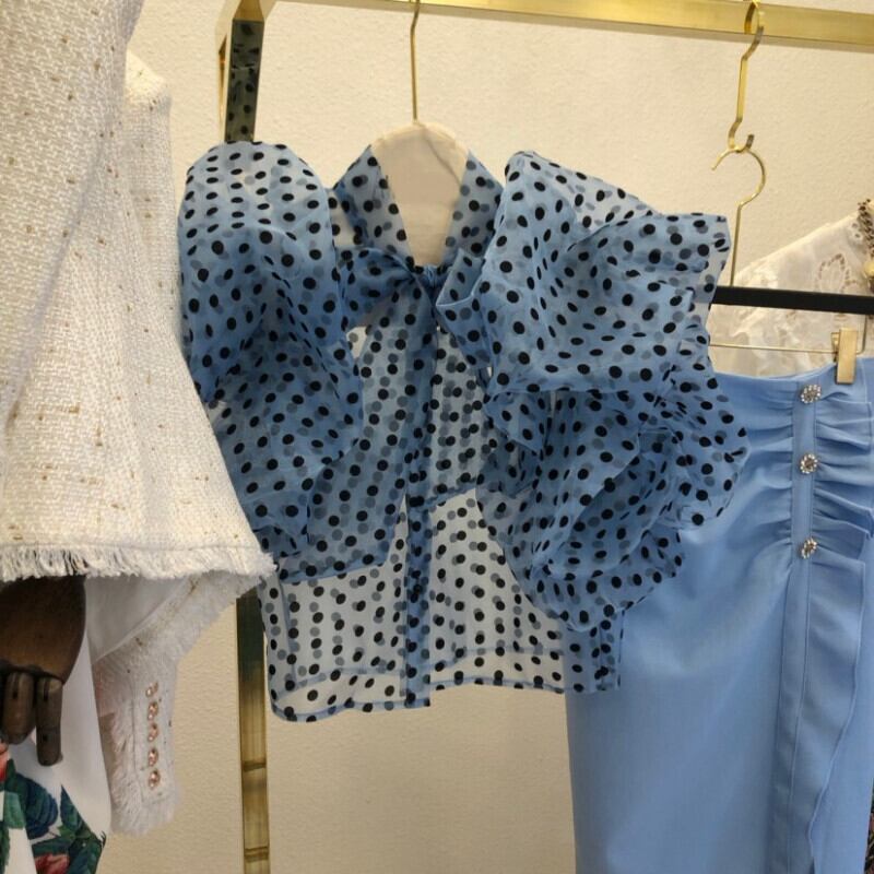 ランタン クロップトップ デ モーダ レースアップ フリル 半袖 ブルー 水玉 シャツ レディース ブラウス 女子 ショート ハーフスリーブ
