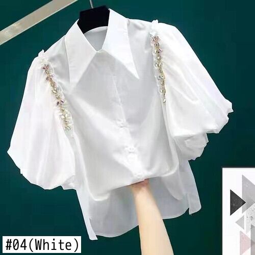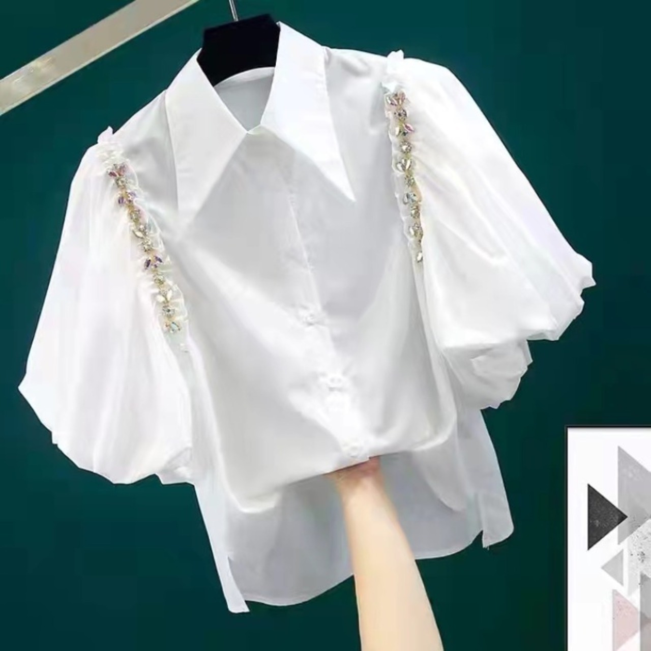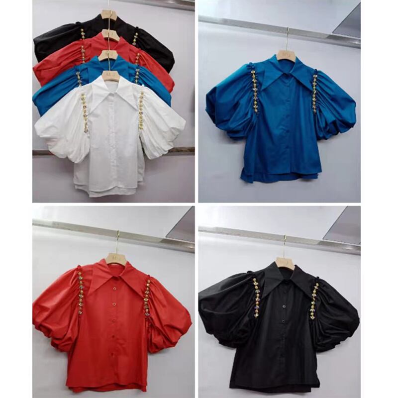 秋夏パフスリーブダイヤモンドチェーン装飾不規則シングルブレストシャツトップブラウス サマー 夏物 オータム 秋物