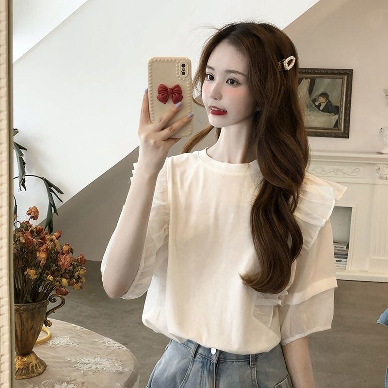 フリルスリーブシフォン半袖人形トップスシャツ春黒 Tシャツワイルドホワイト Tシャツクロップトップス ショート ブラック ハーフスリーブ スプリング 春物