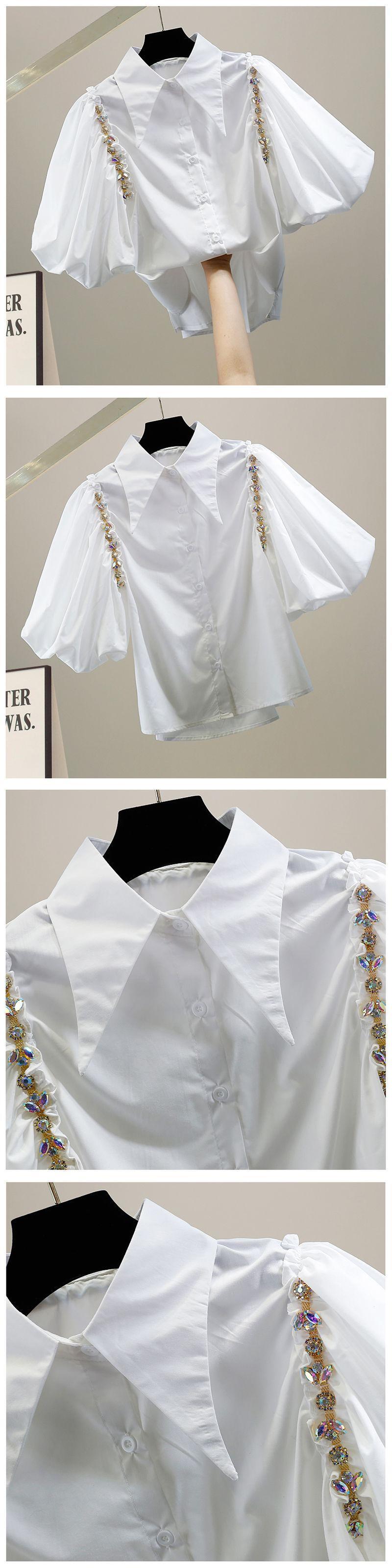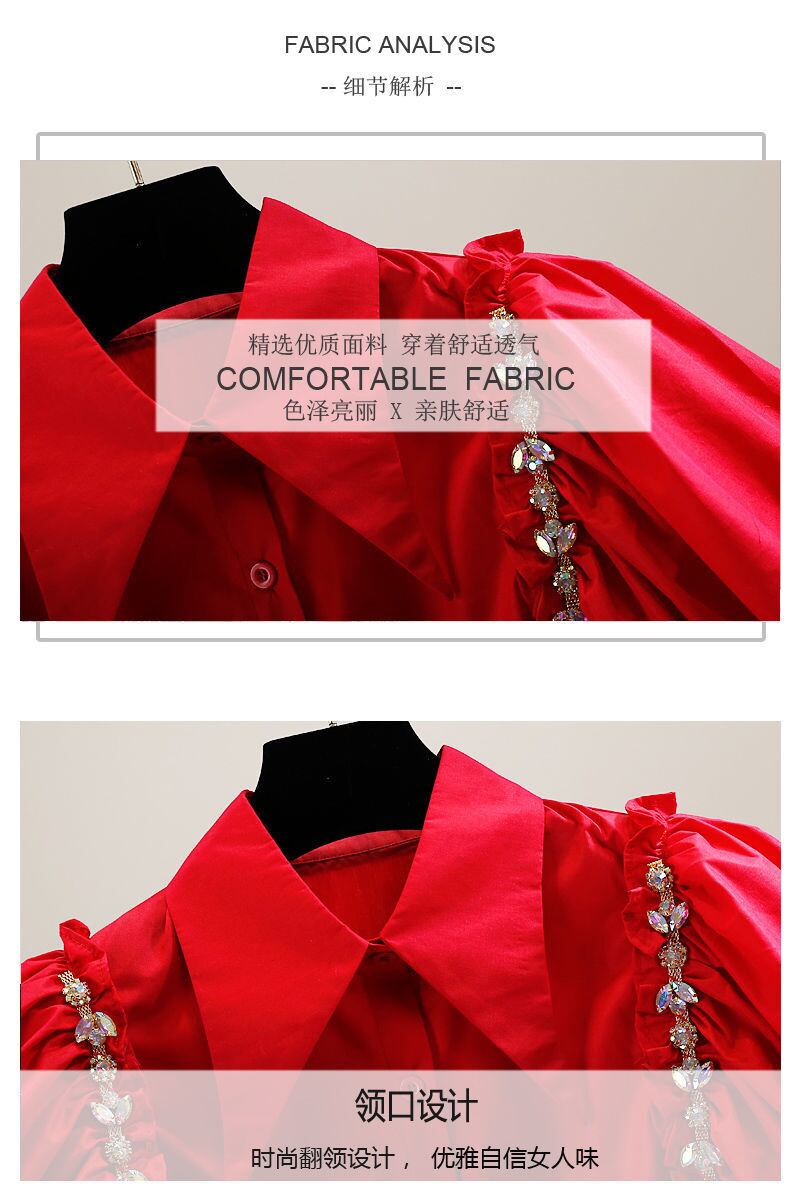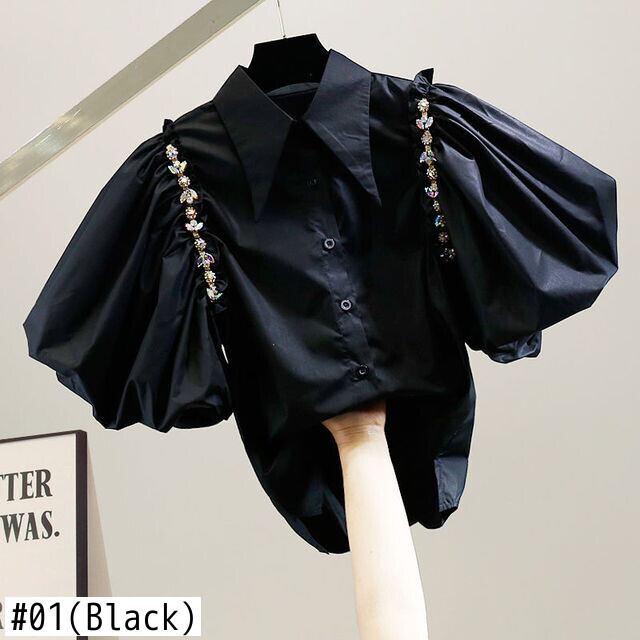 ラインストーンランタン半袖シャツデモーダ春赤ブラウスビーズブラックホワイトトップス ショート レッド ハーフスリーブ スプリング 春物
