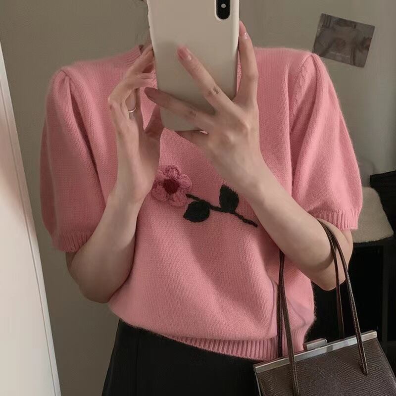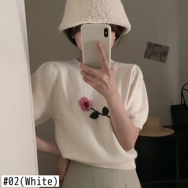ホワイト ラウンド ネック フラワー セーター ジャンパー サマー スウィート パフ ショート スリーブ ニット セーター セーター クロップ セーター トップ 半袖 ハーフスリーブ 大人ガーリー キュート カジュアル 夏物 Oネック フラワーデザイン
