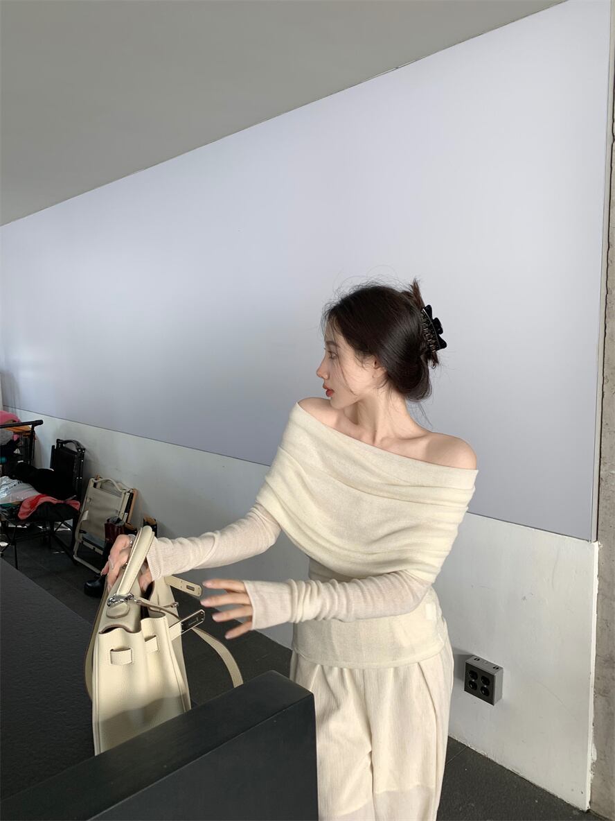 セクシースラッシュネックホワイトセーターオフショルダートップロングスリーブセータージャンパープルオーバー気質ニットセーターレディース 長袖