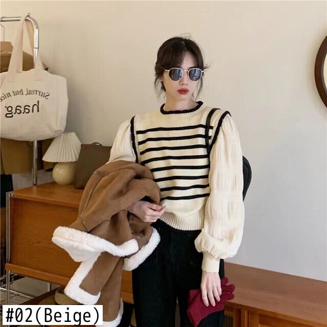 プルオーバー ジャンパー クルーネック ブラック ストライプ セーター フェイク ツーピース シャツ パフ トップ セーター レディース セーター