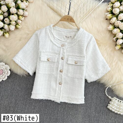 クルーネックシングルブレストショートツイードジャケットスウィートクロップスリーブチェック柄シャツ夏ピンク電話カーディガン Y2k コートトップス 大人ガーリー キュート カジュアル サマー 夏物