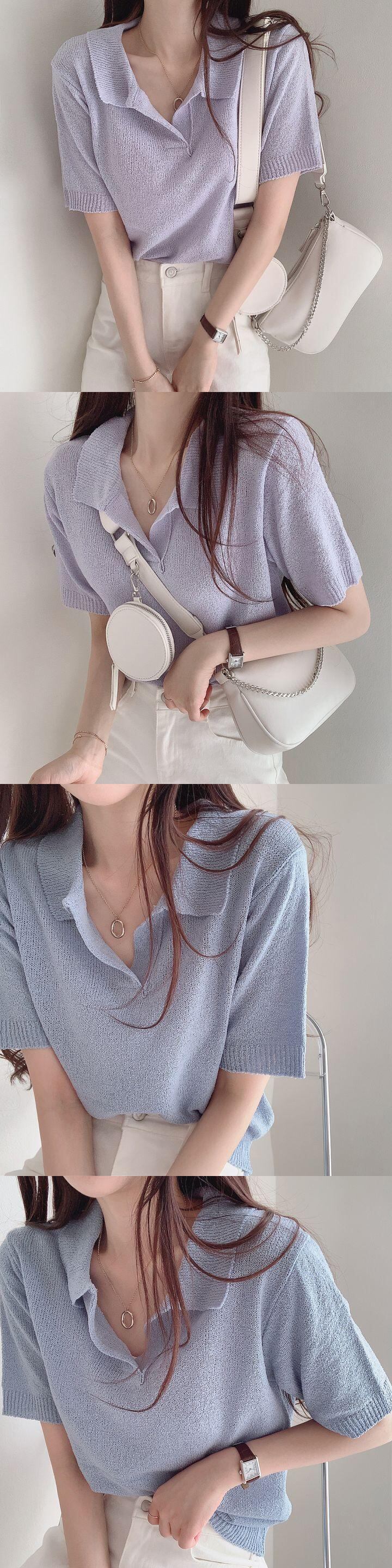 ターンダウン襟半袖セータージャンパーアイストッププルオーバー夏セーターニットシャツ薄型 tシャツ ショート ハーフスリーブ サマー 夏物 シルク ソリッドカラー