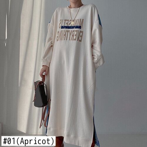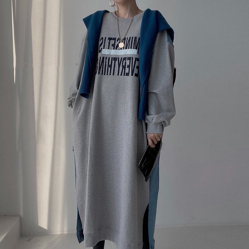 レタープリント コントラストカラー Oネック ランタンスリーブ スプライス デニム セータードレス 春 Vestidos スプリング 春物