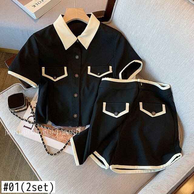 黒ショーツセット半袖ターンダウン襟シャツ t ウエストショーツストリート原宿ホット衣装 ショート ブラック ハーフスリーブ かわいい ブルマー ソリッドカラー