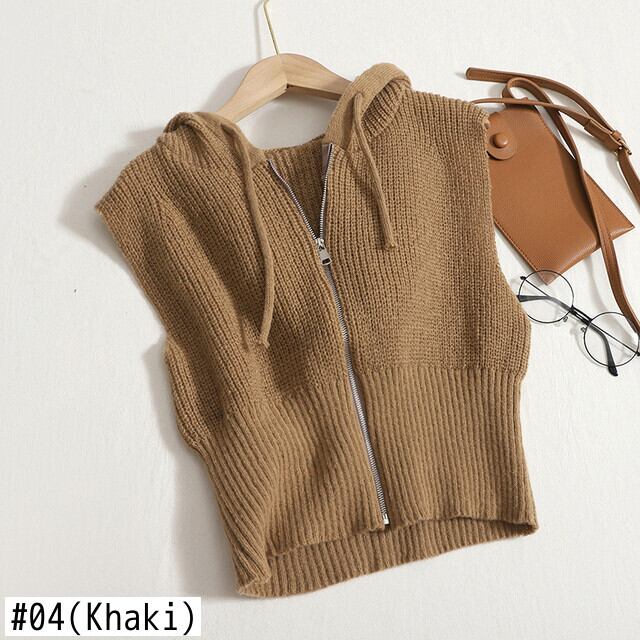 ノースリーブ ワイルド ジップアップ フード付きベスト 無地 カーディガン Colete Feminino セクシー トップ Chalecos ニット セーター ベスト ブラック ホワイト ソリッドカラー