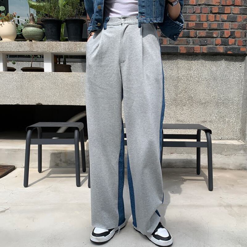 スウェットパンツストリートパンタロンバギーパンツウエストパネルコントラストワイドレッグジーンズカーゴデニムズボン ワイドパンツ
