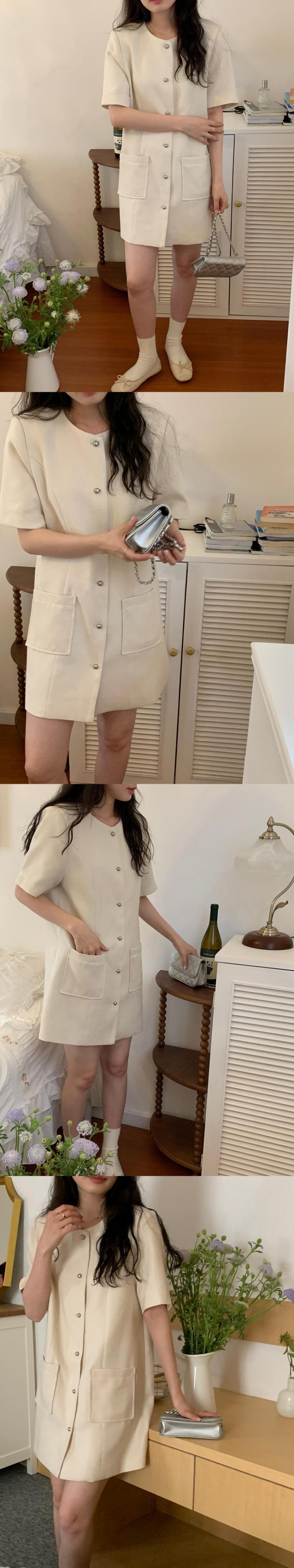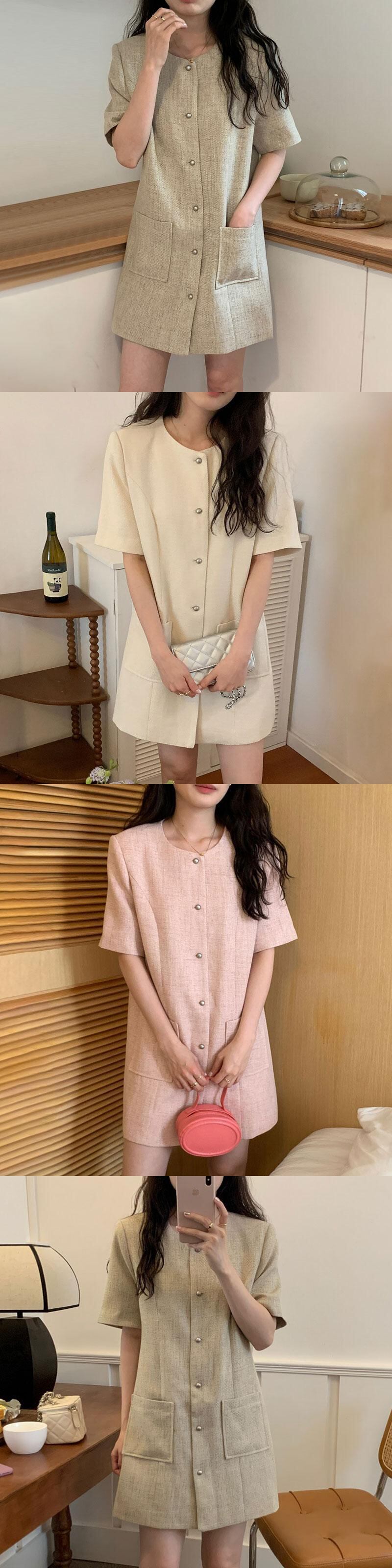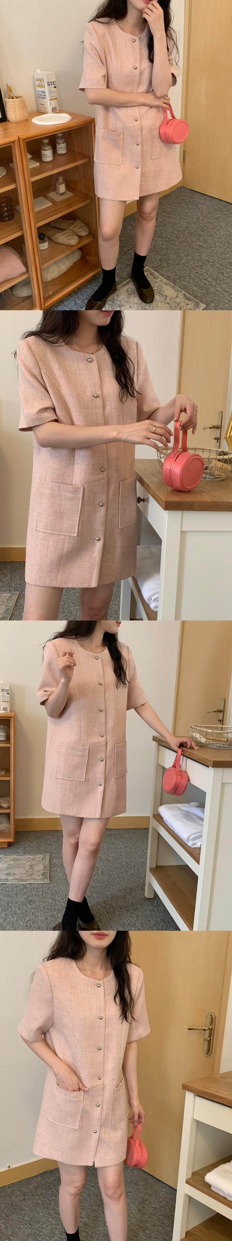 Vestidos De Temperament Oネック シック シングルブレスト ダブルポケット 半袖 ツイードワンピース ピンク チェック ミニワンピース レディース ショート ハーフスリーブ