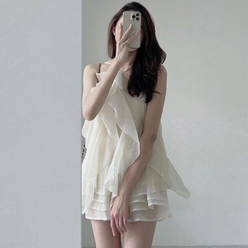 ボヘミアン ドレス ハンギング ネック レイヤー フリル ノースリーブ スリング ドレス ショート セクシー グリーン シフォン ドレス ローブ Vestidos
