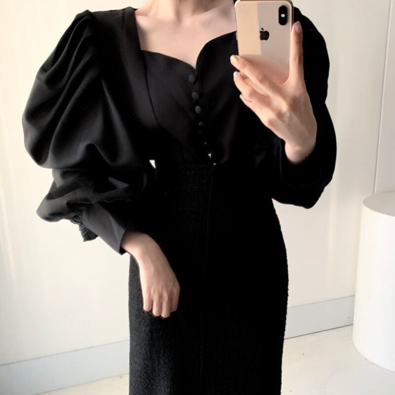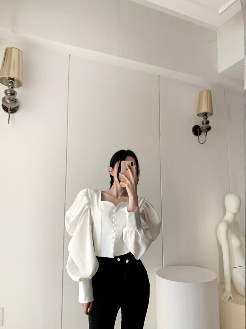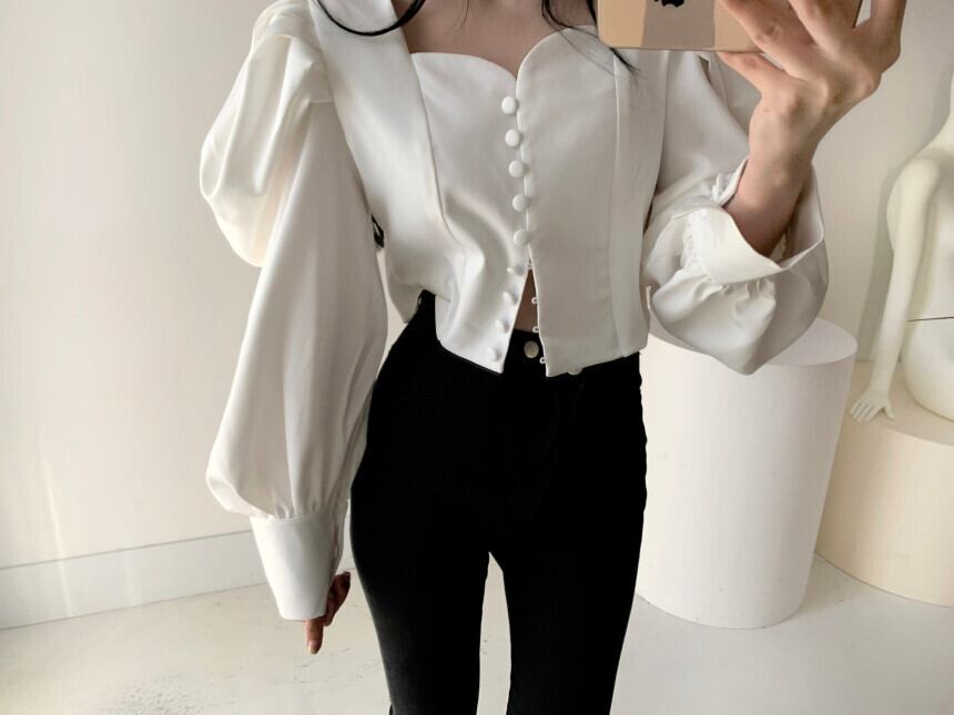 気質ランタンスリーブ白シャツ Blusa セクシークロップトップシックボタンスクエアブラウスシャツ ホワイト スクウェア