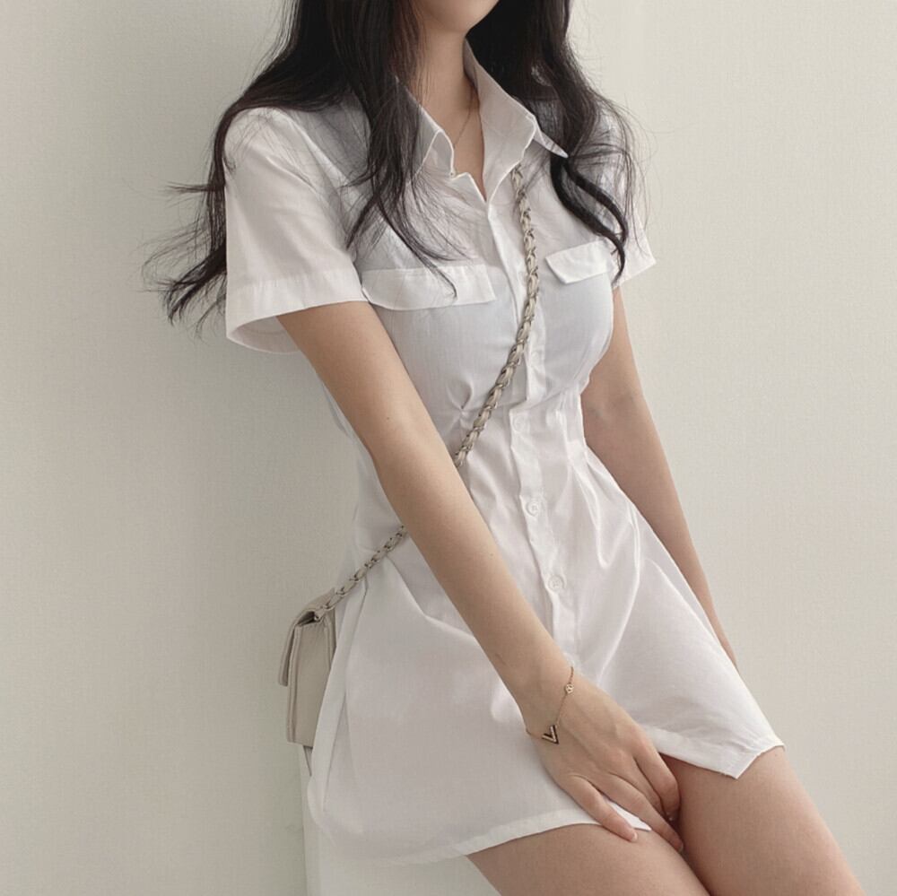 夏 Vestidos デ スリム プリーツ ホワイト半袖シャツ ドレス ラペル ワイルドドレス ウエスト ショート ハーフスリーブ サマー 夏物