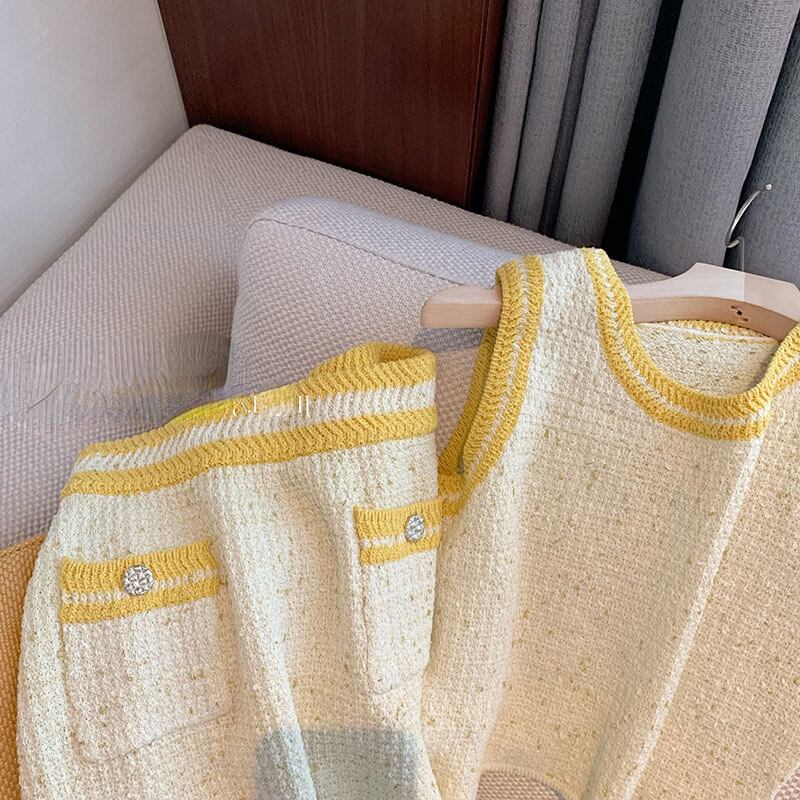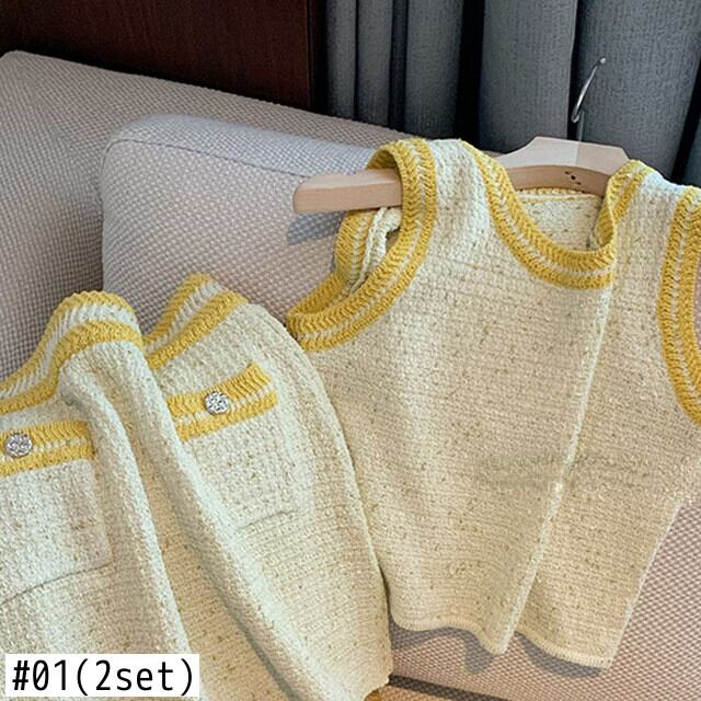 タンクトップ キャミソール イエロー ニット ベスト スリム ミニ 気質 コントラスト スカート セット トップス 春 2点セット 衣装 スプリング 春物