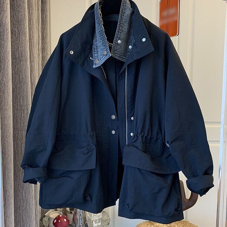 フェイク ツーピース トレンチ ドローストリング ウエスト ジッパー デニム ジャケット Jaqueta ルーズ コート 秋 Chaquetas オータム 秋物
