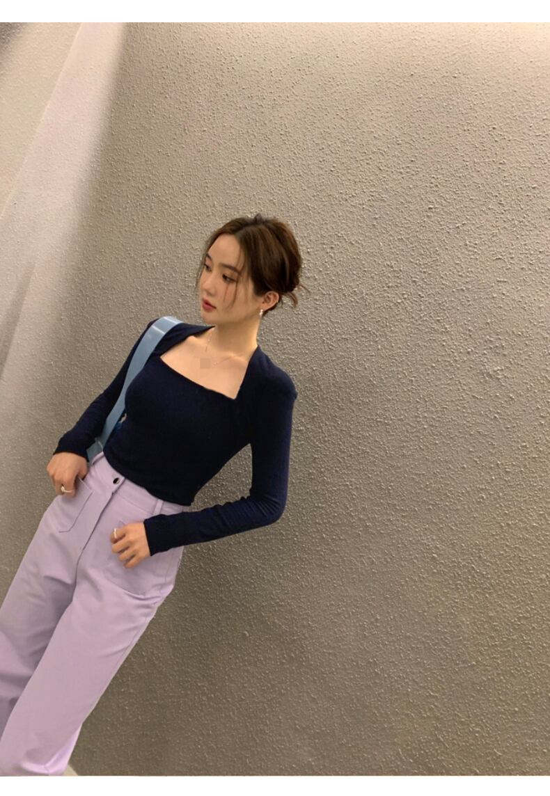 シャツセクシーレトロストラップレストップスリム野生長袖 Tシャツスクエア Tシャツ美的服シンプル Tシャツ Ropa ロング スクウェア
