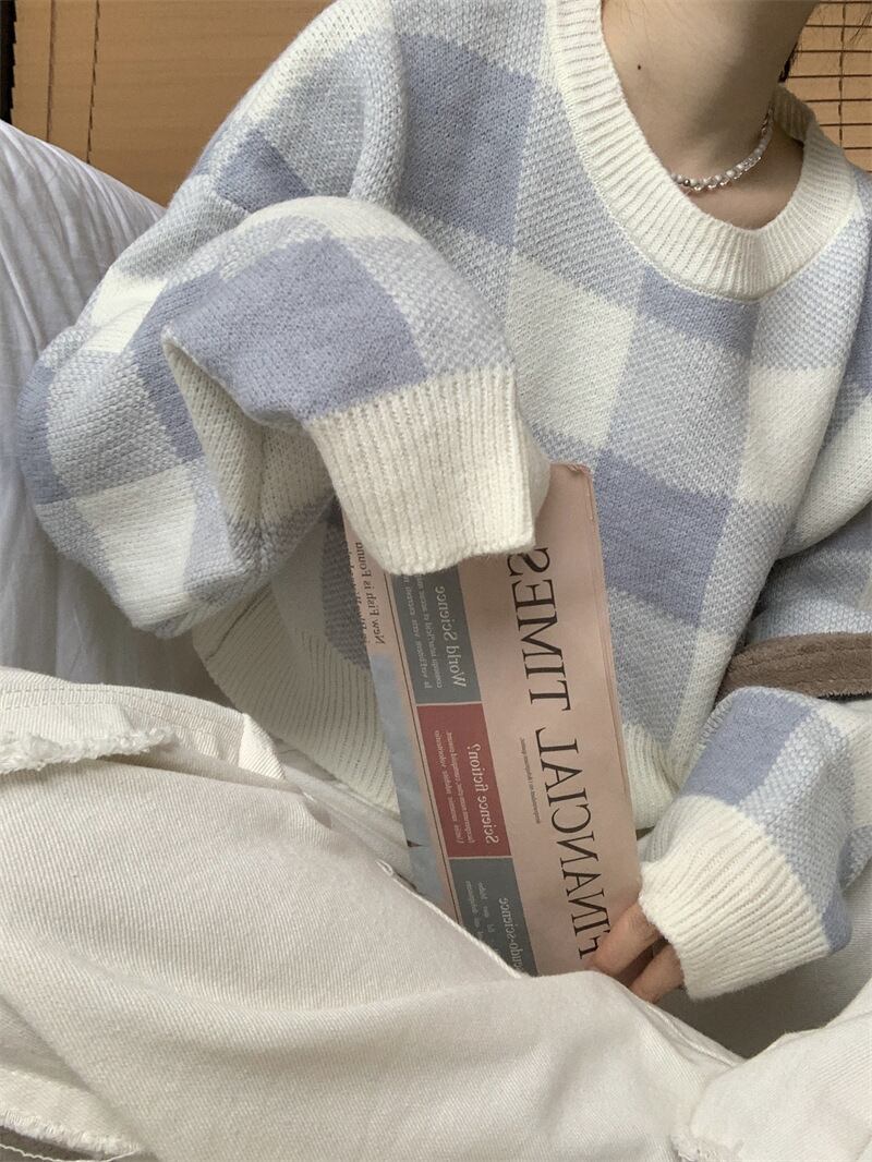 春ショートコントラストブルーチェック柄セータースウィートセータープル長袖トッププルオーバーセータージャンパー Y2k ロング 大人ガーリー キュート カジュアル スプリング 春物