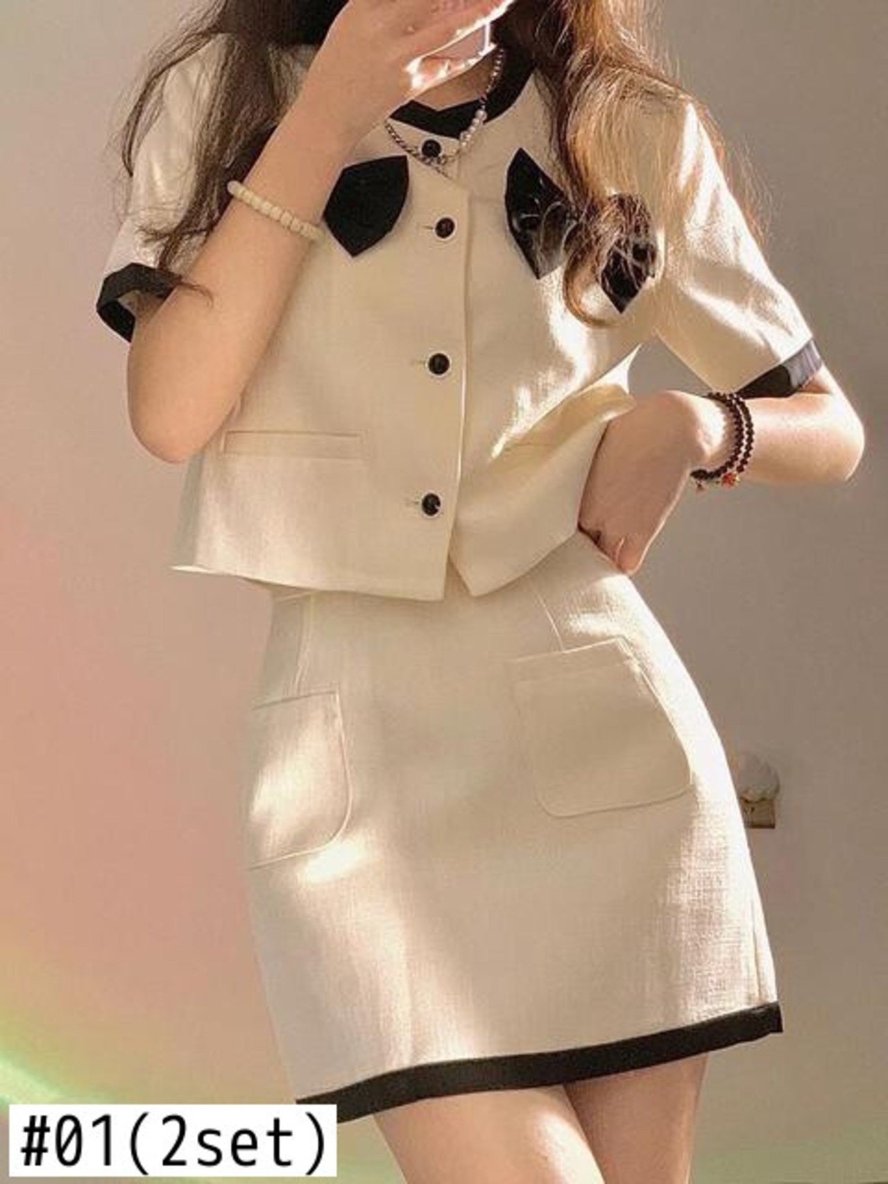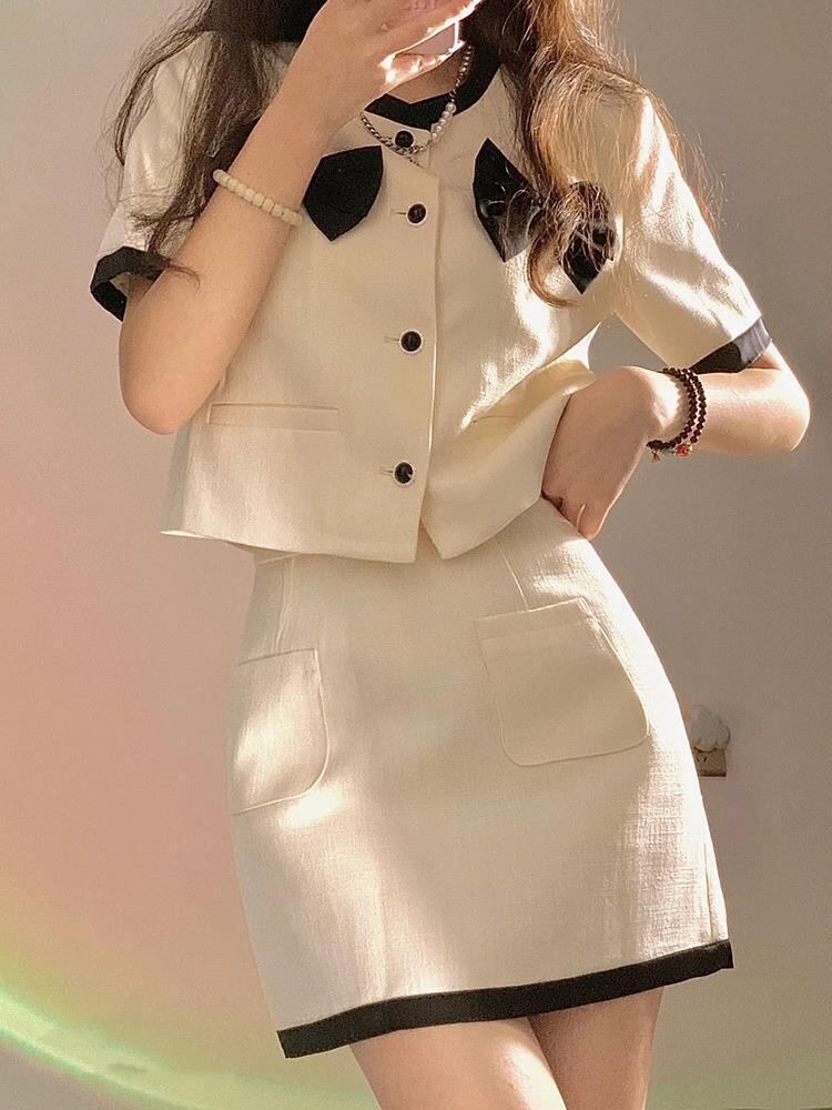 2 個セット気質半袖カーディガン弓トップクロップスーツ夏ブラウスシャツミニスカートセット Y2k シャツ ショート リボン ハーフスリーブ サマー 夏物
