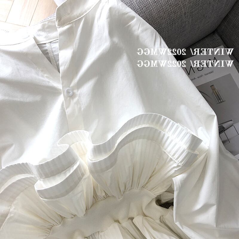 ミニマリズム気質シャツウエストフリルブラウススタイル白シャツプリーツ宮殿トップス ホワイト レース