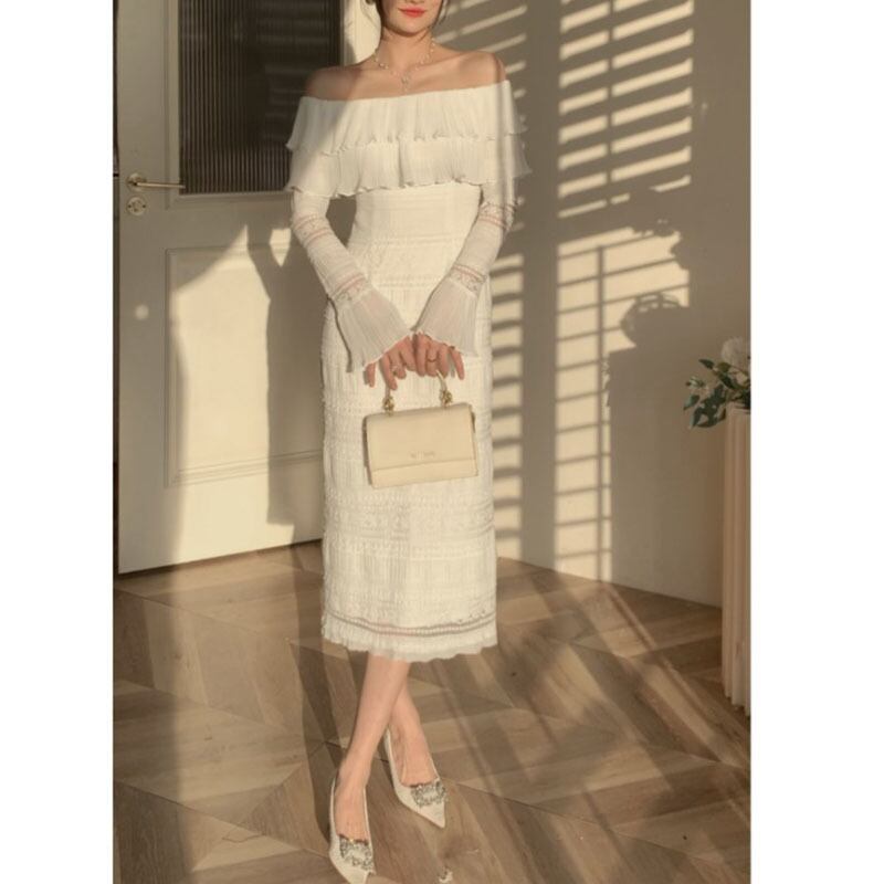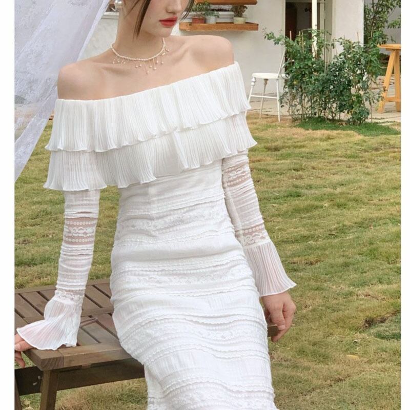 Aライン スラッシュネック 気質 オフショルダー ホワイトケーキドレス Vestidos De Bodycon フルスリーブ レディース フリル ロングドレス
