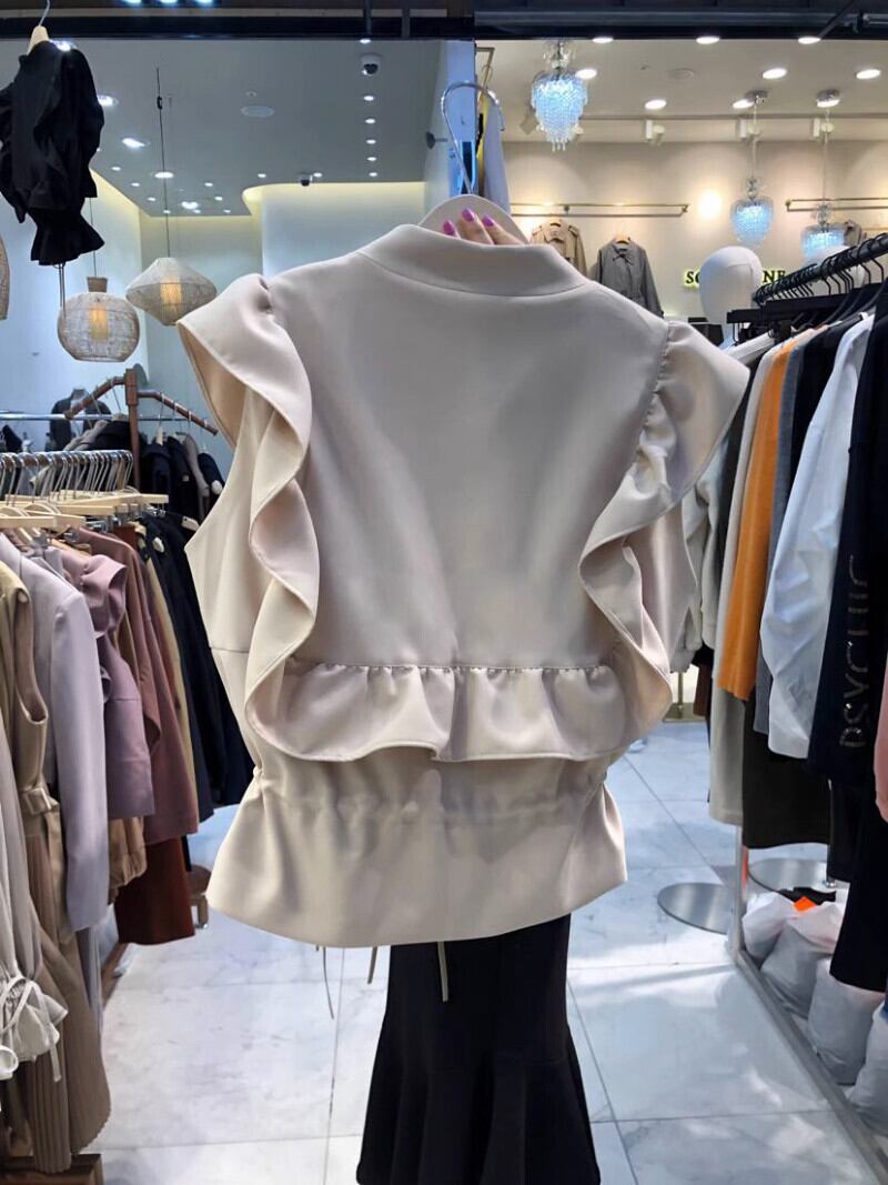 Chaleco ソリッド ブラック フリル ベスト セクシー クロップ トップ ドローストリング シャツ スリム ジッパー スタイル ジレ スーツ ラップ コート ソリッドカラー