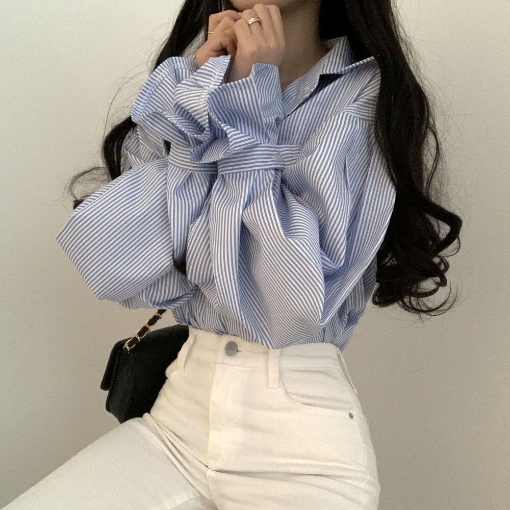 シャツ レディース スタイル 長袖 白黒 ストライプシャツ ルーズトップス フレアブラウス ブルー s ロング ホワイト ブラック