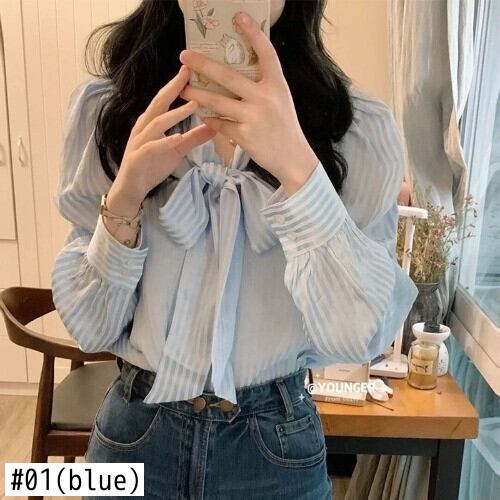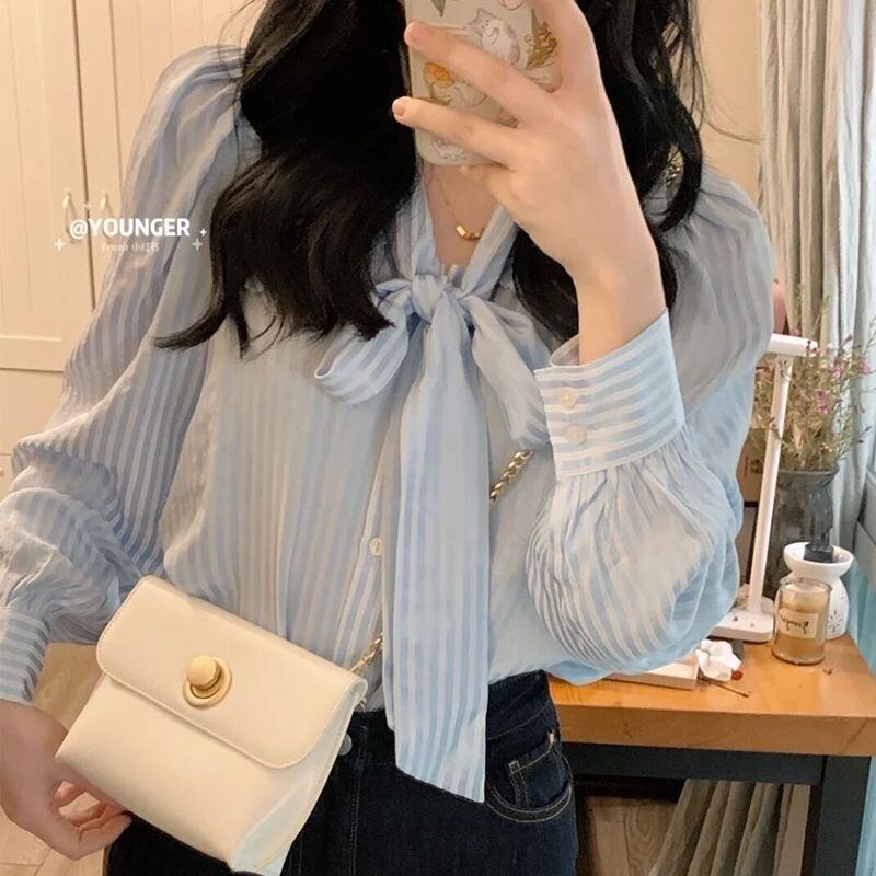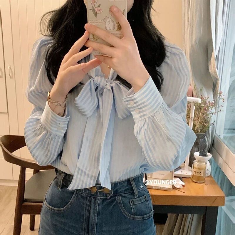 弓レースアップシャツ春ブルーストライプシャツレディルーズブラウスワイルド スプリング 春物