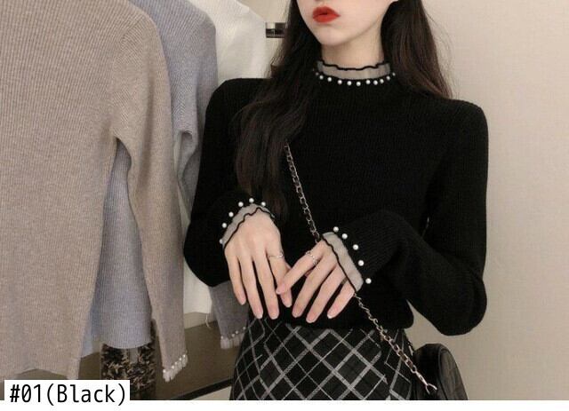 ニットセータースリム生き抜くハーフカラー長袖黒セーターセータービーズジャンパーシャツ ロング ブラック