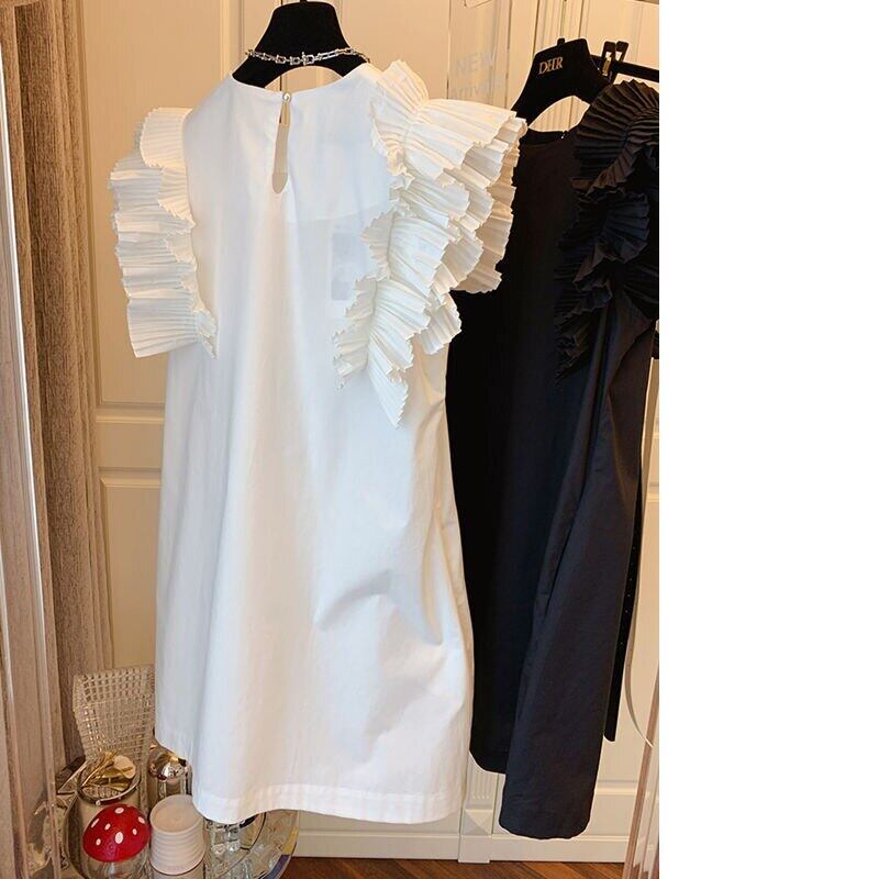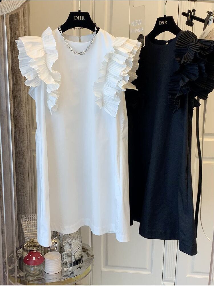 夏ルーズミニドレス Vestidos ノースリーブプリーツフリルソリッドスリムフライングスリーブドレス黒、白シャツベストタンク ホワイト ブラック サマー 夏物 ソリッドカラー