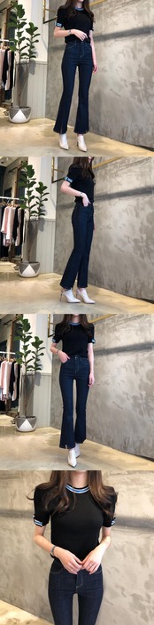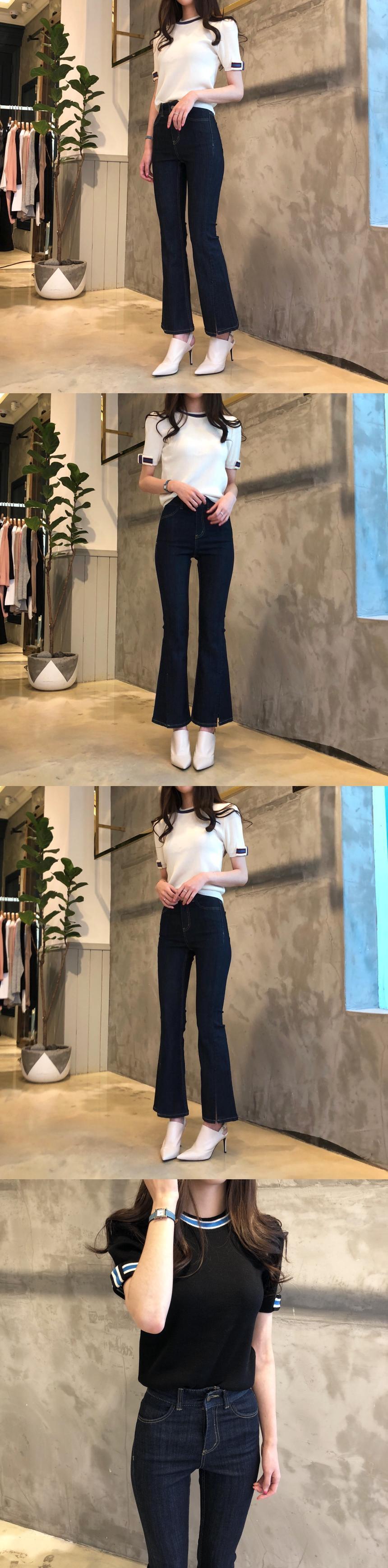 シック夏シンプルクルーネックコントラストスリムフィットアイス半袖プルオーバーニットセーターシャツトップス ショート ハーフスリーブ サマー 夏物 シルク