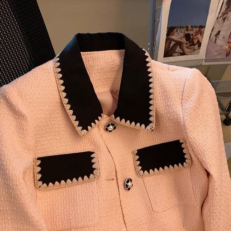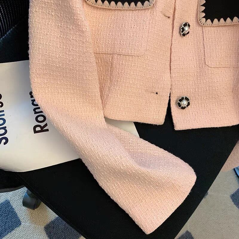 冬服コートターンダウン襟コントラストパッチワークピンクジャケットポケットシングルブレスト冬格子縞ジャケット ウィンター 冬物