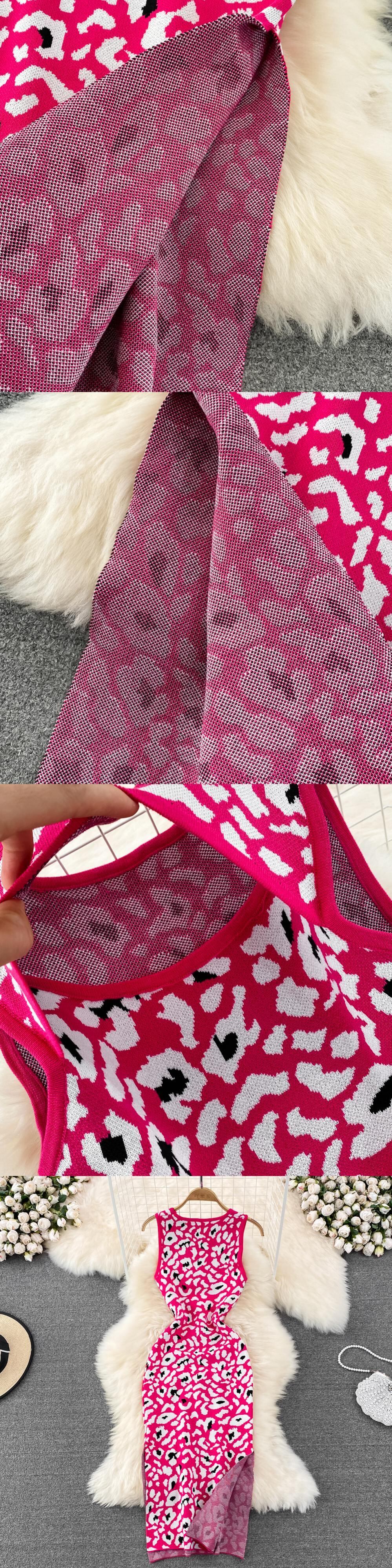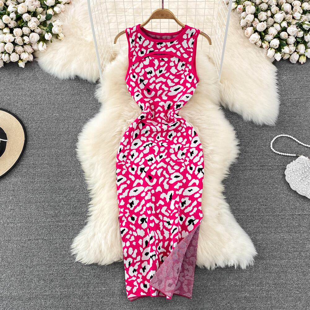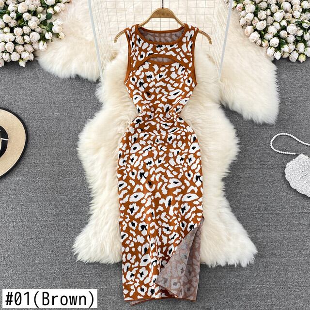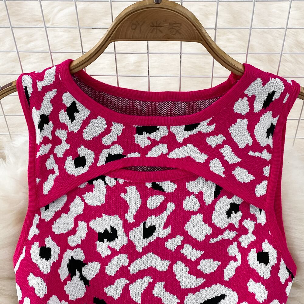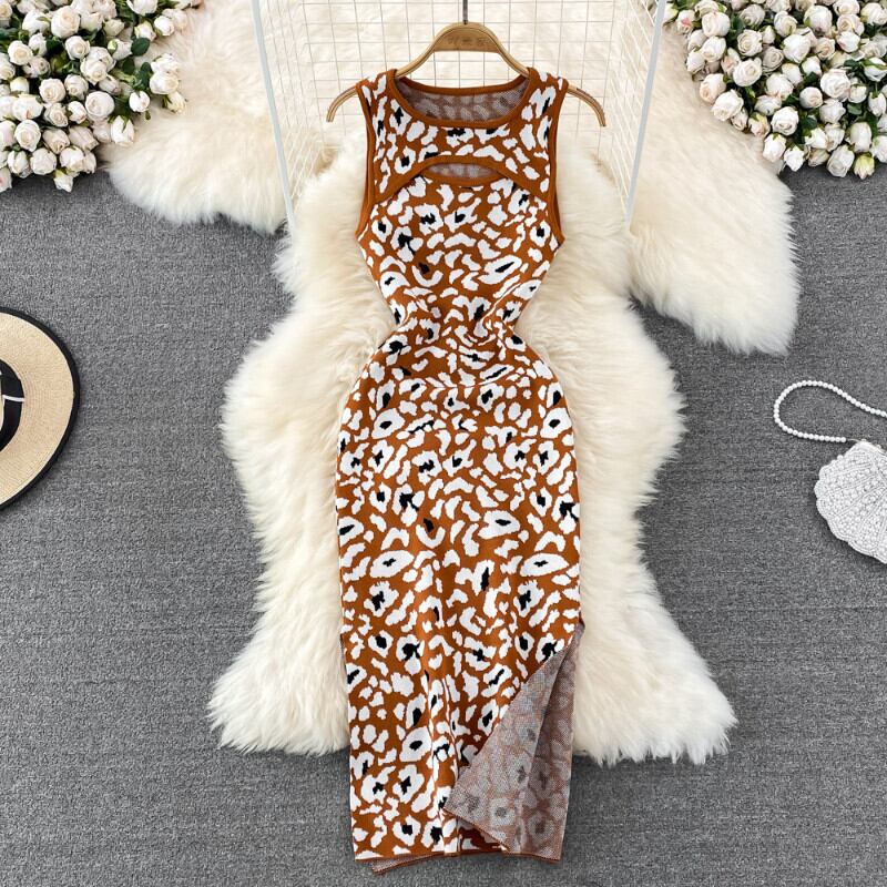 弾性 Vestido ボディコンセクシー Y2k ニット中空アウトベストヒョウドレスプリントセータードレス誕生日パーティー エラスティック 伸縮
