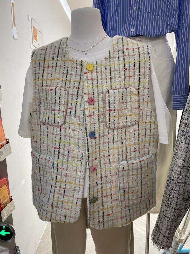Chaleco ポケットシックチェック柄チョッキ Colete Feminino O ネックジャケットツイードベスト秋 Chaquetas ウール オータム 秋物 Oネック