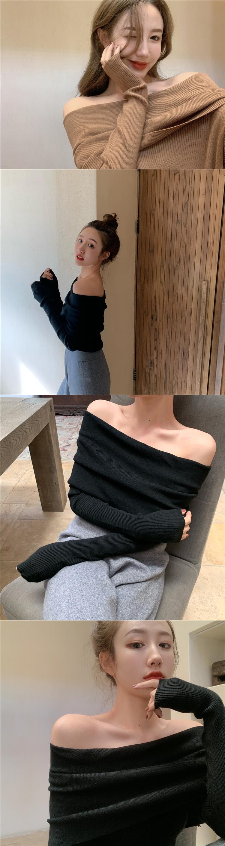 スラッシュネック オフショルダー セーター スリム セーター ジャンパー プルオーバー ブラック クロップド セーター トップス レディース