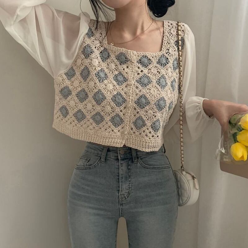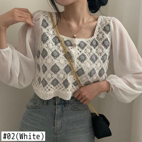 甘いかぎ針編みパッチワーク シフォン シャツ es es ショート トップス スリム スタイル スクエア ブラウスシャツ 大人ガーリー スウィート キュート カジュアル スクウェア