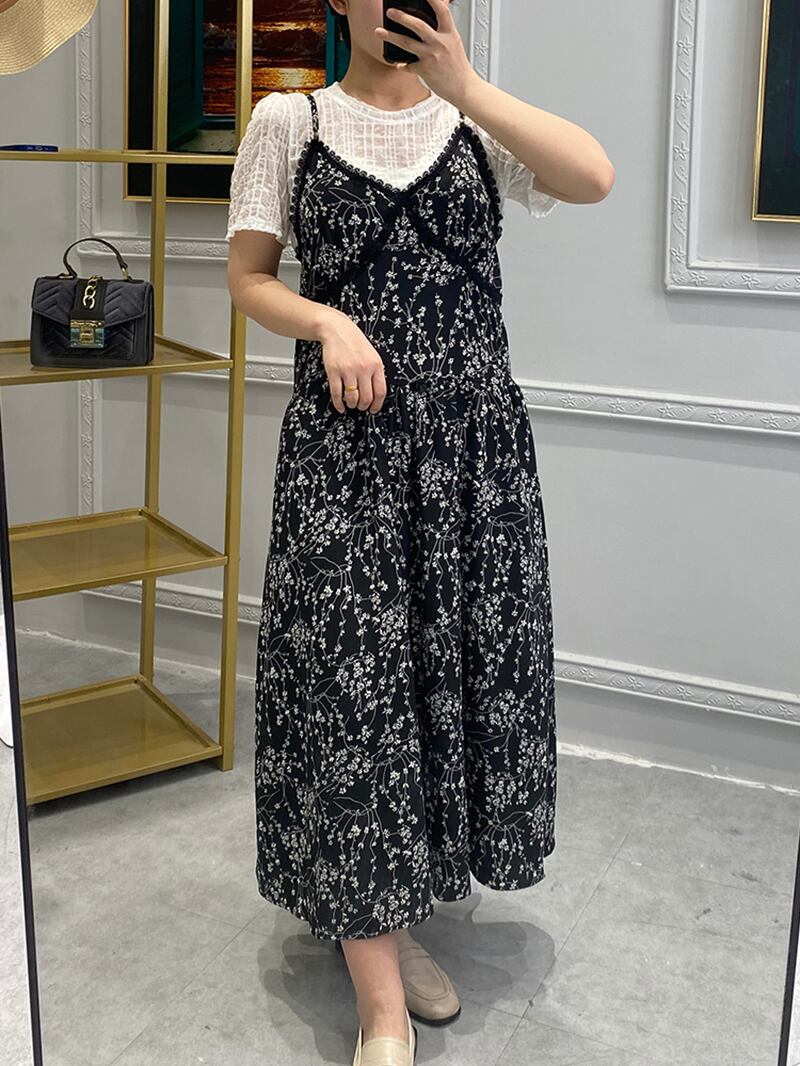 V ネック レース花柄シフォン サスペンダー ドレス シック夏優しい甘い O ネック チェック柄半袖シャツ ホワイト ショート ハーフスリーブ 大人ガーリー スウィート キュート カジュアル サマー 夏物 Oネック Vネック
