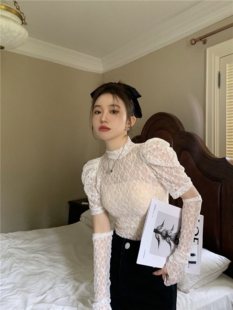 宮廷気質風 ホワイトレースシャツ ワイルドメッシュトップス s es ハーフカラー 透視ブラウス